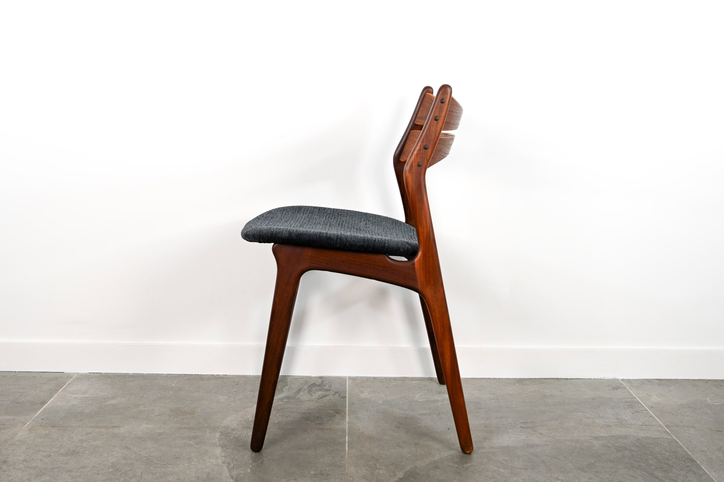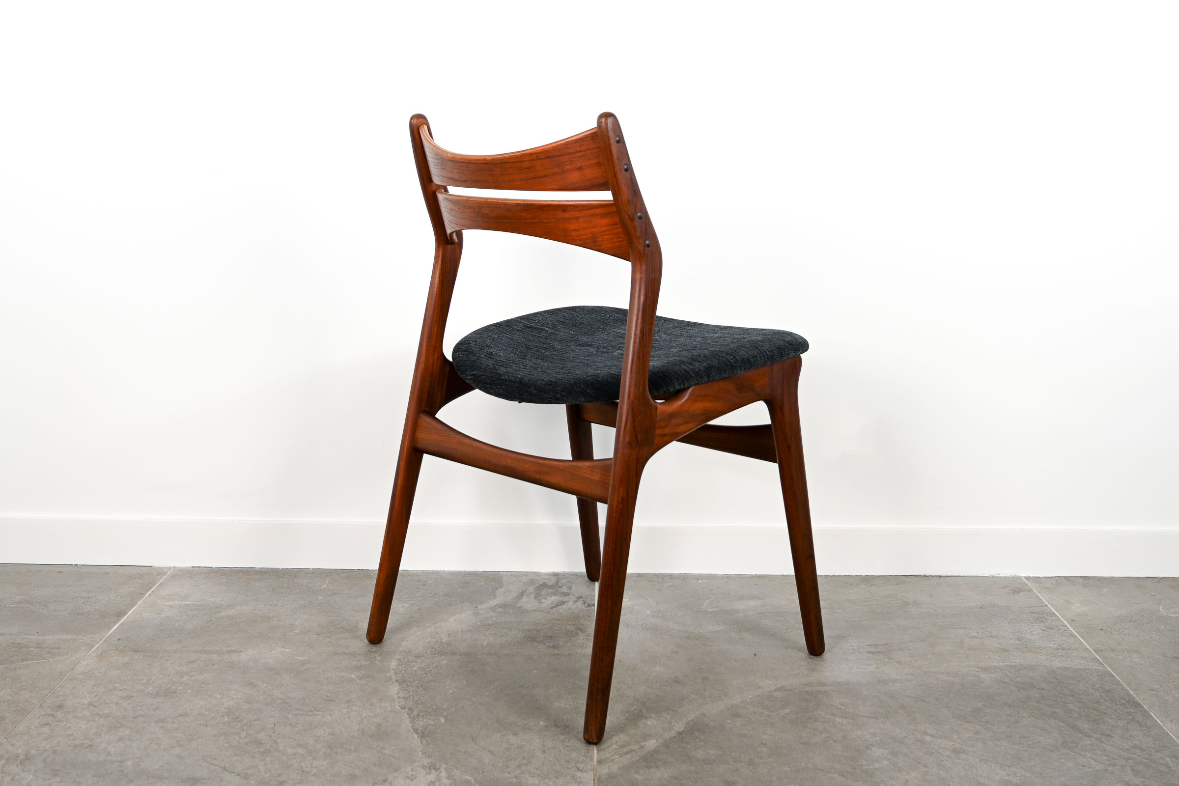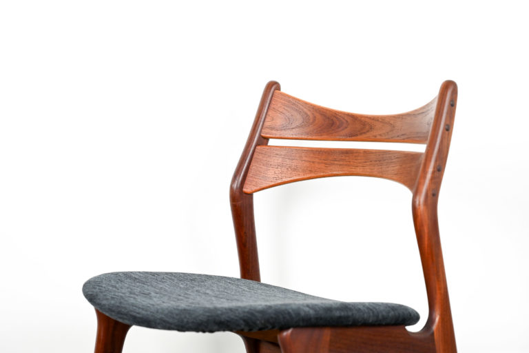 Chaise de table en teck, assise re-tapissée en tissu dans les tons bleu gris