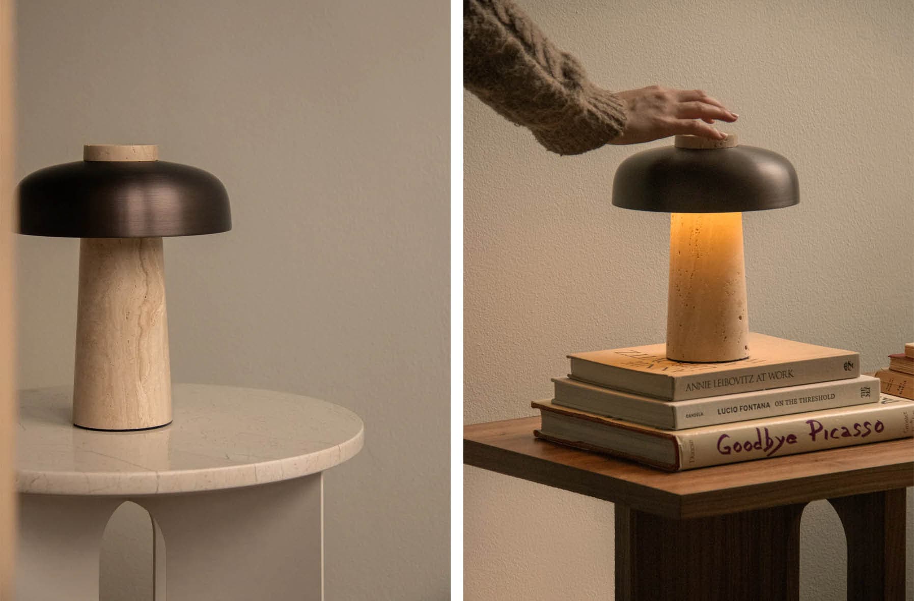 Base en travertin avec abat-jour en aluminium en laiton bronzé